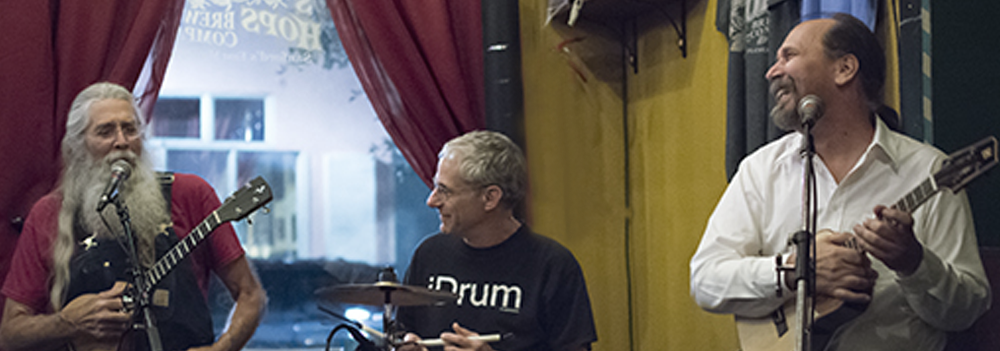 Their song list crosses ten decades of music. They mix originals in with the covers they love. One of Thom’s songs was recorded by Supe Granda of the Ozark Mountain Daredevils, and two of David’s songs were recorded by the group for the Narrow Boat Sessions, Great Britain’s premier folk music organization. PBS produced a segment of Thom’s involvement with the ukulele which featured The Flea Bitten Dawgs.