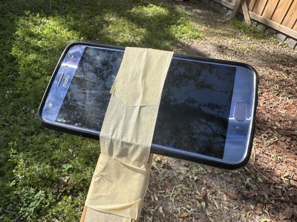 So I took one of my old Androids — a Moto x4, which was a great mid-range phone that offered a lot of bang for the buck back in 2017 — and securely taped it to a long slat from a the renovation project from when we moved in. I knew it would come in handy someday.