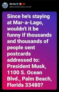 send postcards to president musk at mar-a-lago Post author By Joey deVilla Post date February 22, 2025