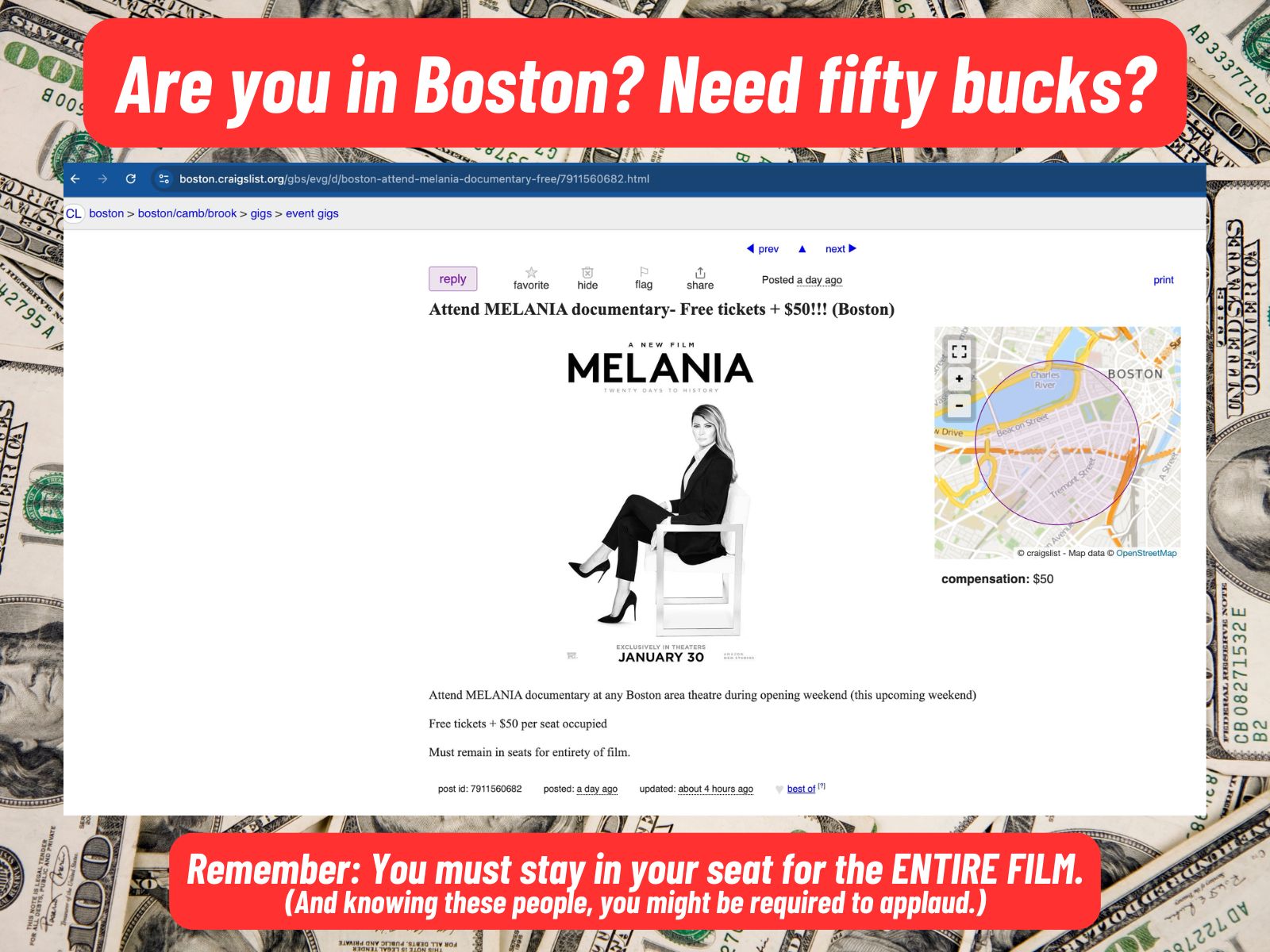So it should come as no surprise that they’re now paying people to watch the unwatched (and from some reviews, unwatchable) Melania film. Pictured above is a screenshot I took from Craigslist Boston at around 4 p.m. on Thursday, January 29th. (Here’s the link to the Craigslist ad.)