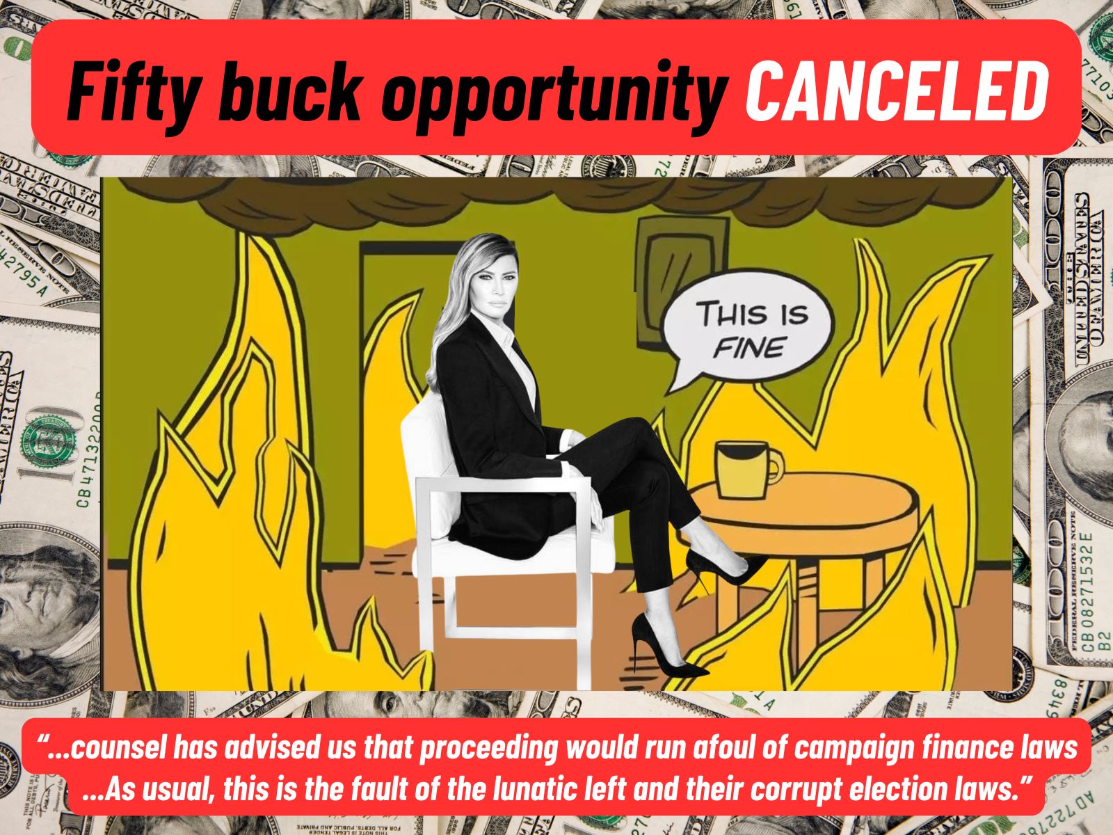 However, due to widespread coverage and backlash surrounding this offer in the fake news media, counsel has advised us that proceeding would run afoul of campaign finance laws. Considering the funding of the film by Amazon, we were shocked to hear this, but cannot take the risk.