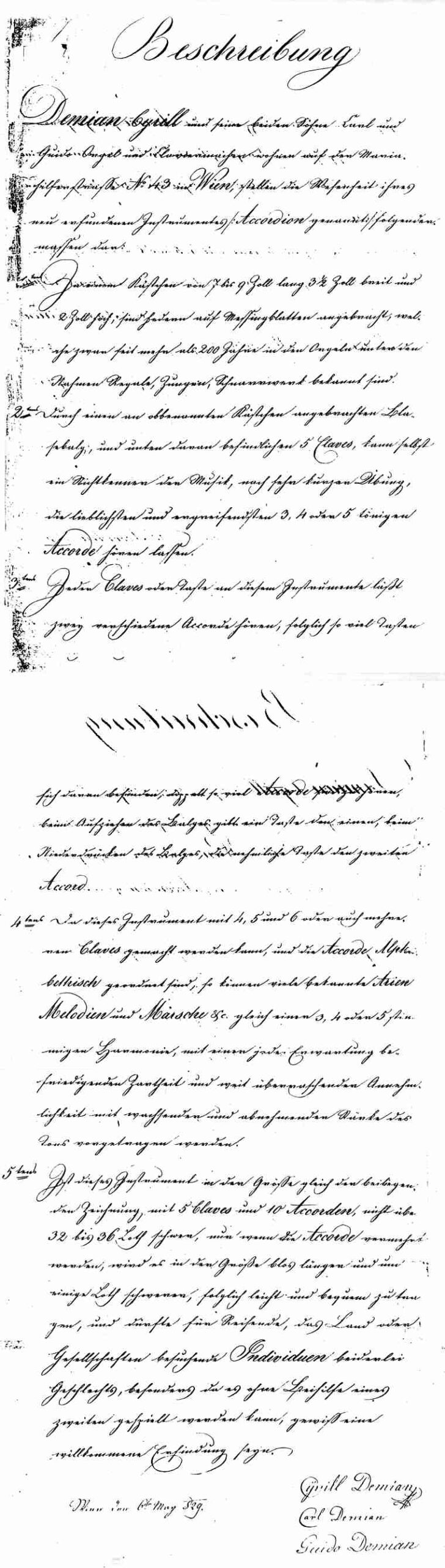 Demian Cyrill and both of his sons, Karl and Guido, organ and piano makers, residing at Mariahilferstrasse No. 43 in Vienna, describe the characteristics of their newly invented instrument — called Accordion — this way.