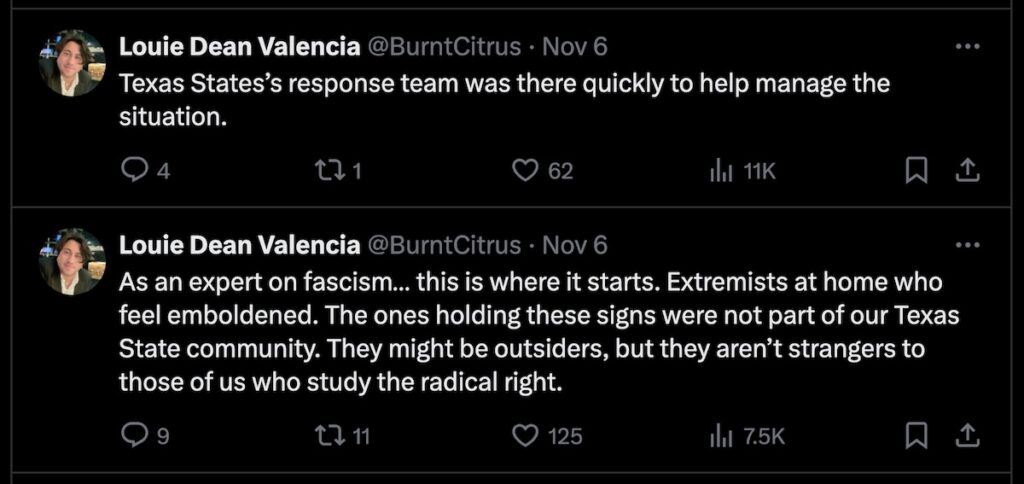 As an expert on fascism… this is where it starts. Extremists at home who feel emboldened. The ones holding these signs were not part of our Texas State community. They might be outsiders, but they aren’t strangers to those of us who study the radical right.