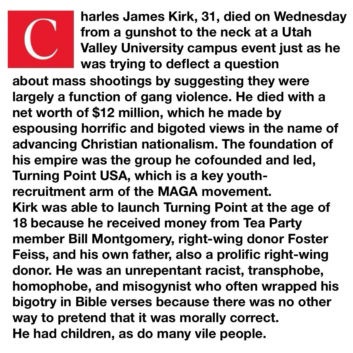 At another school in another state — Utah Valley University in Orem, Utah — Charlie Kirk, founder of right-wing student agitprop group Turning Point USA, was shot dead during one of his “come debate with me” sessions that he’s known for. He’s so well-known for it that he was parodied on a recent South Park episode (which Kirk is said to have “praised”):
