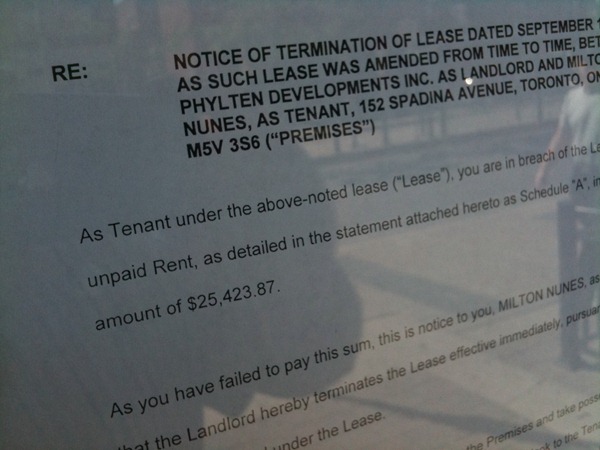Le Gourmand, the little French cafe on Spadina between Queen and Richmond, has been locked down by the landlord after falling behind in rent by over $25,000. The unhappy news about the place that I said had “The Best Damned Chocolate Chip Cookie in the City” was brought to me by fellow HacklabTO member Stefan Arentz, who took the picture of the notice on their door above.