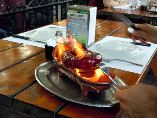 One of their appetizers is listed in the menu in English as “flaming sausage”, and the name is truth in advertising: