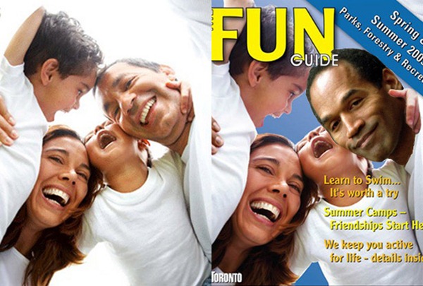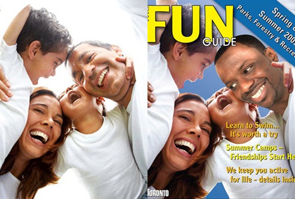 Accordion City has a reputation for its great blend of different nationalities, races and cultures, and it’s one of the reasons I love this place. However, there are times when the folks at City Hall, in their well-intentioned attempts to be inclusive, seem to be trying a little too hard. Case in point: how the stock photo, pictured below on the left, got photoshopped (and quite obviously, too) into the cover of the Toronto Fun Guide, pictured below on the right: