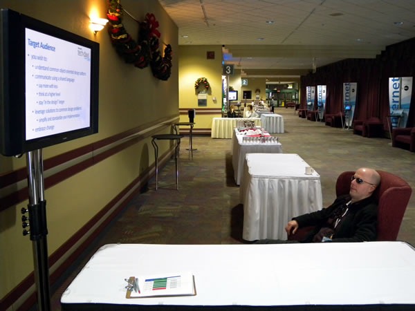 But one guy, whose back was made sore by the conference room chairs, took a clever approach. We broadcast all sessions’ projections and audio on a monitor outside every room, so he took one of the comfy chairs in the hallway outside and set himself up for some living room-style viewing: