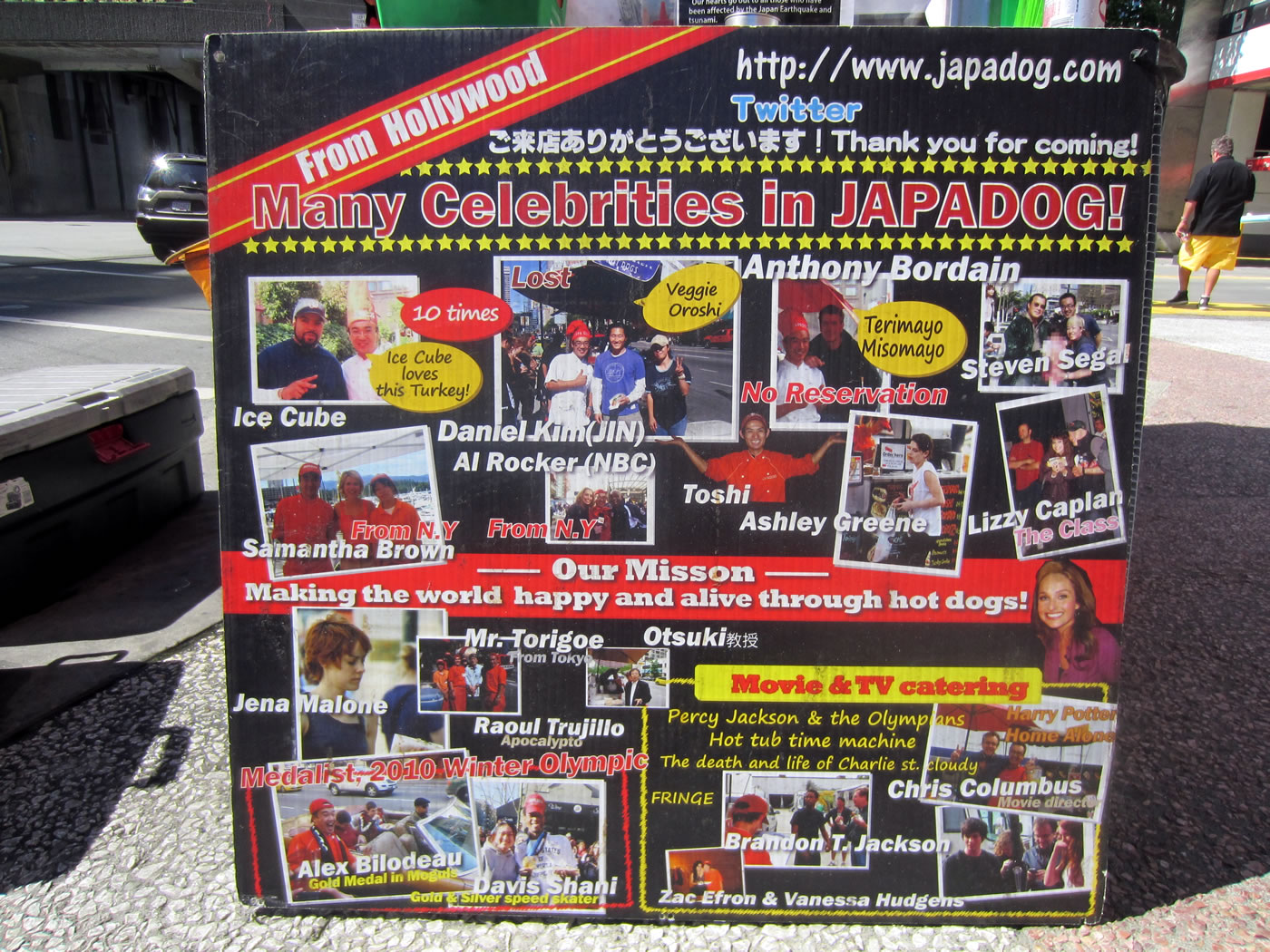 Part of Japadog’s charm is their delightful Engrish signage. It’s so very charmingly quirky that I wouldn’t be surprised if their misspellings and malapropisms were intentional. After all, they did get me to take this photo and post it online: