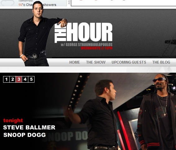 Fo’shizzle my Ballizle: on tonight’s episode of CBC’s news show The Hour, “Strombo”’s interviewing an unlikely pair: the CEO of the company for whom I work, Steve Ballmer, and Snoop Dogg. Alas, they’re taping the segments separately, so there’s no chance of Ballmer and Snoop doing a rap duet called Win and Juice.